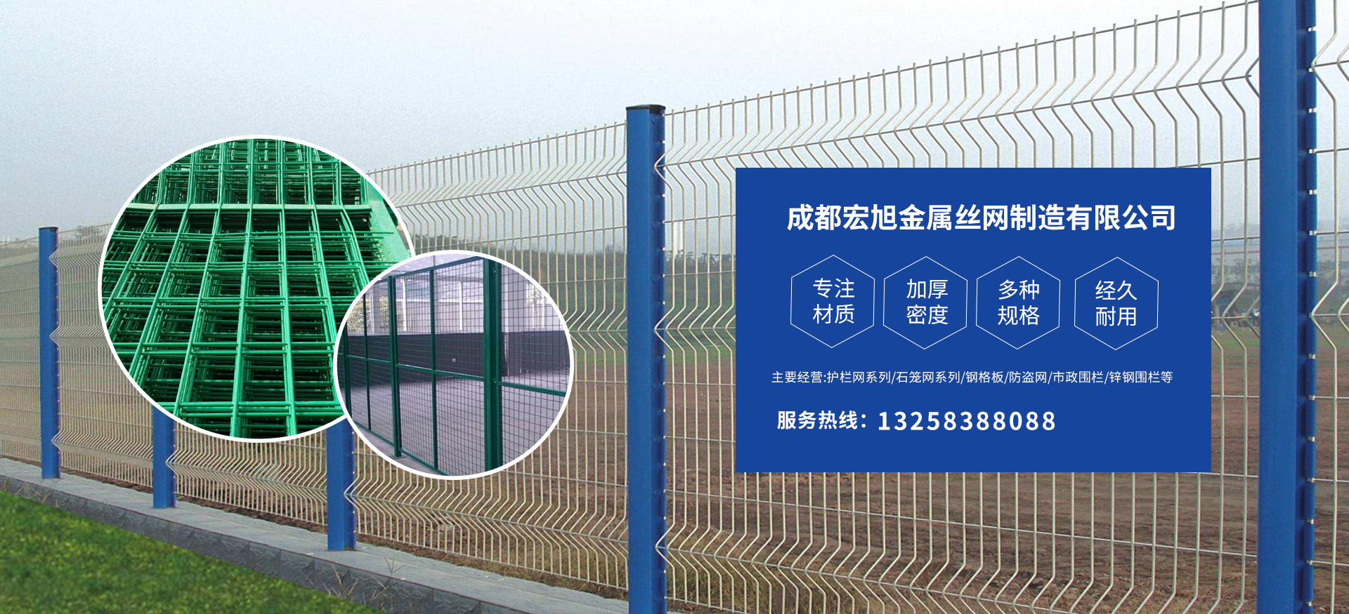 成都宏旭金屬絲網(wǎng)制造有限公司主營(yíng)護(hù)欄網(wǎng)系列、石籠網(wǎng)系列、鋼格板、防盜網(wǎng)、市政圍欄、鋅鋼圍欄、鋼筋網(wǎng)片、聲屏障系列、波形護(hù)欄板、柔性纜索護(hù)欄、SNS邊坡防護(hù)網(wǎng)等其他絲網(wǎng)類(lèi)產(chǎn)品。特殊規(guī)格可加工定做,也可根據(jù)客戶(hù)來(lái)圖來(lái)樣定做。自創(chuàng)業(yè)以來(lái),公司一直堅(jiān)持市場(chǎng)為導(dǎo)向,以客戶(hù)為根本,以實(shí)業(yè)為基礎(chǔ),以技術(shù)為支持,以科研為后盾,集科研、生產(chǎn)、經(jīng)營(yíng)為一體,不斷研制開(kāi)發(fā)新產(chǎn)品,開(kāi)拓市場(chǎng),走綜合發(fā)展之路。多年來(lái),公司憑借過(guò)硬的質(zhì)量,良好的信譽(yù)、優(yōu)質(zhì)的服務(wù)、合理的價(jià)格,贏得了市場(chǎng)和商家的一致好評(píng)。